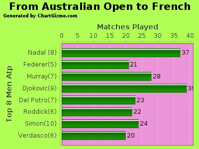 Please find a chart which shows how many events ( excluding davis cup and teams events) for the top 8 ranked ATP men and number of matches played since the Australian Open until the start of the French Open.Simon the French player and World ranked number 7 leads the most tournaments played with 10.Djokovic has the most wins with 39 playing 9 tournaments.In brackets on the chart is the number of events each player has played.