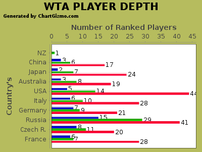 It is not surprising that Russia has the most female players inside the top 100 with 15 players.The women's stats are somewhat interesting and one can see by looking deeper into each country's player base its not hard to see who will be dominating for sometime.Russia will continue dominance with female players for a long time, 29 Russian's are ranked inside the top 200 and increases to 41 if you look at the top 500.Next is another Eastern block country the Czech Republic have 8 inside the top 100 increases to 11 top 200 and 20 top 500.The women's game is very different from the men's with Spain and France leading the way in the Men's game. France in the ladies has 6 inside the Top 100 , 7 top 200 and 28 top 500 so depth wise looking OK.Germany is steady also with 7 inside the top 100, 9 inside the top 200 and 21 inside the top 500.Italy is also doing well in the Women's game 6 inside the top 100, 10 inside the top 200 and 28 inside the top 500 so definitely a Nation to watch.The USA has 5 inside the top 100 ,14 inside the top 200 and 44 inside the top 500 so looks like they are building also.Spain who are so dominate in the Men's have 4 inside the top 100 , 9 inside the top 200 and 23 inside the top 500.Lets look at closer to home Asia and Oceania region.Australia have just 3 inside the top 100 , 8 inside the top 200 and 19 inside the top 500.Doing it hard and not looking good for the next few years either.China has 3 inside the top 100 , 6 inside the top 200 and 17 inside the top 500, a large nation and looking at numbers depth wise still has a lot of work to do.Japan has 2 inside the top 100 , 7 inside the top 200 and 24 inside the top 500.Good little players and emphasis "little" genetically can not dominate in the current world game. And now New Zealand! Just 1 player inside the Top 200 and that's Sacha Jones at 163.Marina Erakovic is now 675!So look at the statistics if you are seriously thinking of winning Wimbledon or being inside the top 10 players in the World.Stats are against us for sure this side again as I have said in previous articles key component's...... depth and mind set ....essential for a strong tennis environment.